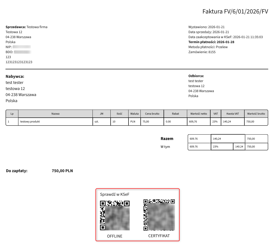 W tym trybie na dokumencie zostają umieszczone dwa kody QR, ponieważ w momencie wystawienia faktura nie znajduje się jeszcze w KSeF i nie posiada nadanego numeru. Jeden kod pozwala zweryfikować wystawcę dokumentu (certyfikat), a drugi umożliwia weryfikację faktury w KSeF po jej późniejszym przesłaniu i zaakceptowaniu przez system.