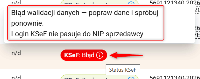 - Status KSeF: Informacja o aktualnym etapie obsługi dokumentu w KSeF (np. Oczekujące, W trakcie przetwarzania czy Zaakceptowane). Szczegóły statusu znajdziesz, najeżdżając kursorem na ikonę informacyjną przy konkretnej pozycji.