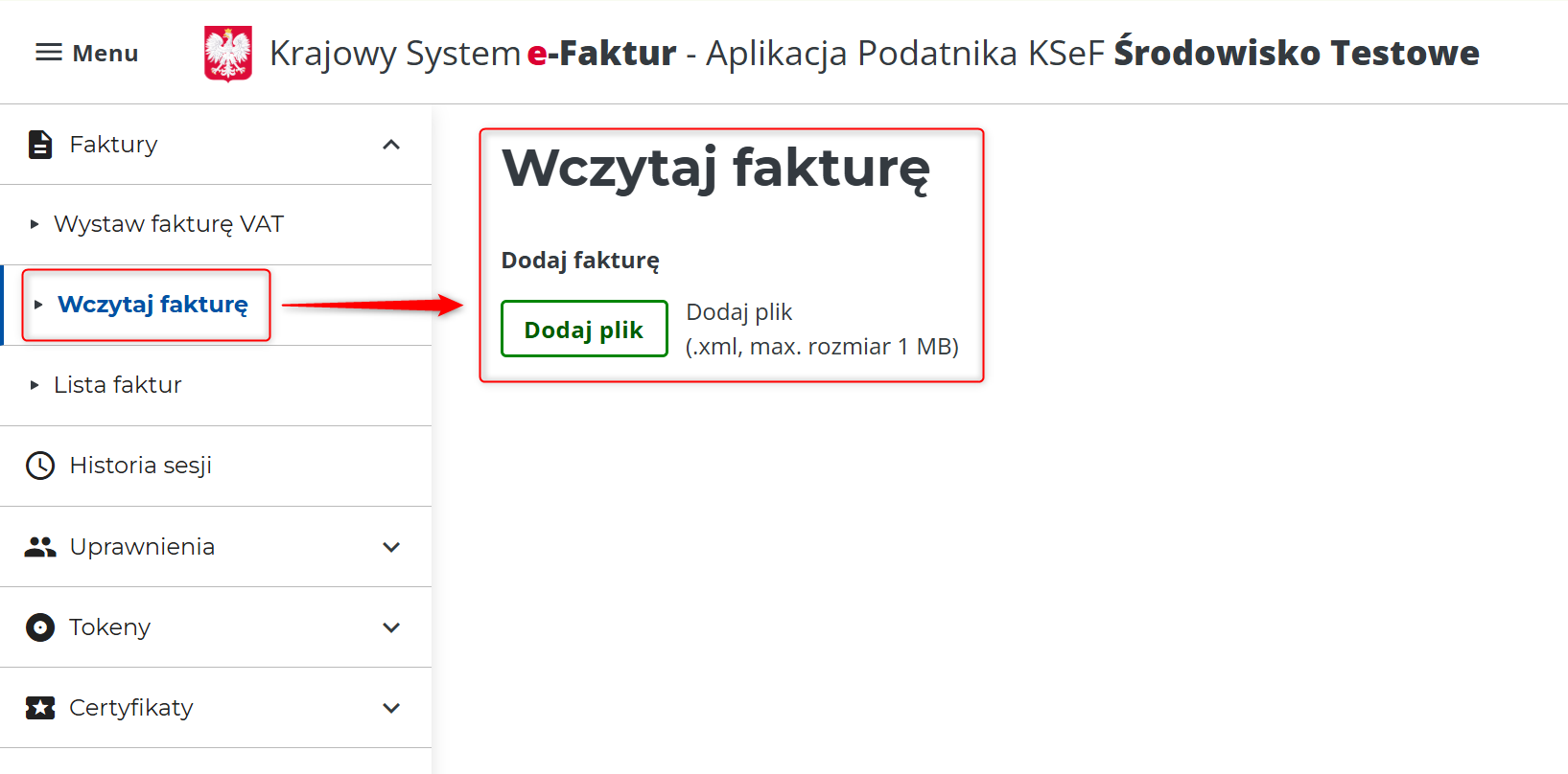 3. Przejdź do panelu KSeF i wgraj dokument ręcznie (Faktury → Wczytaj fakturę → Dodaj plik).