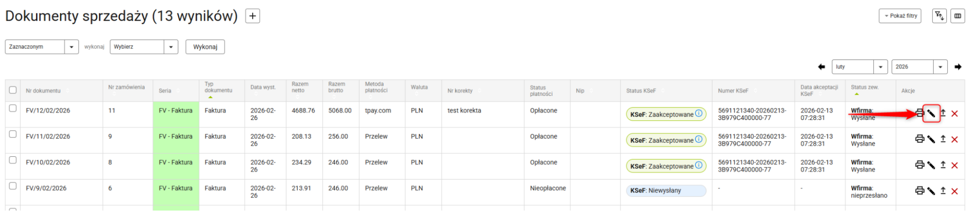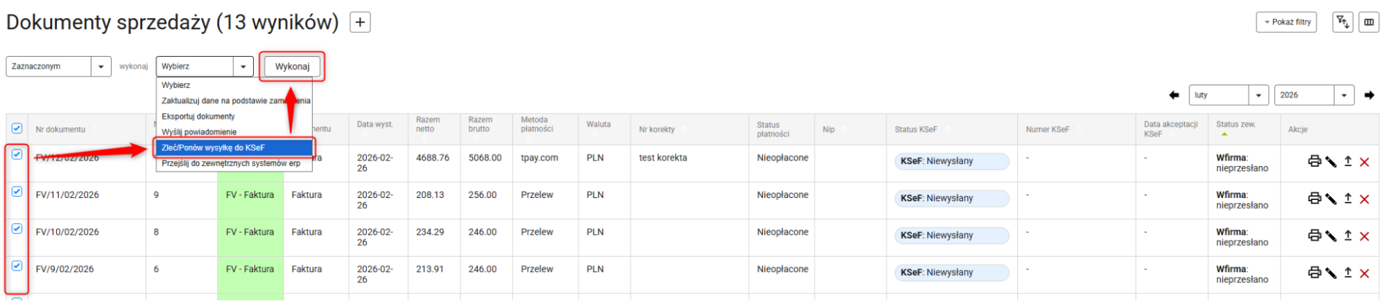 Aby ręcznie wysłać do KSeF wiele dokumentów na raz, przejdź na listę dokumentów sprzedaży i zaznacz wybrane pozycje. Następnie z rozwijanej listy akcji masowych wybierz Zleć/Ponów wysyłkę do KSeF i kliknij przycisk Wykonaj.