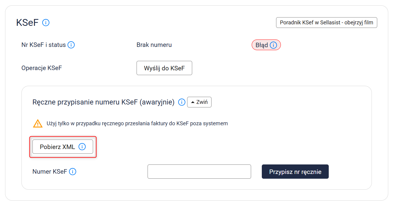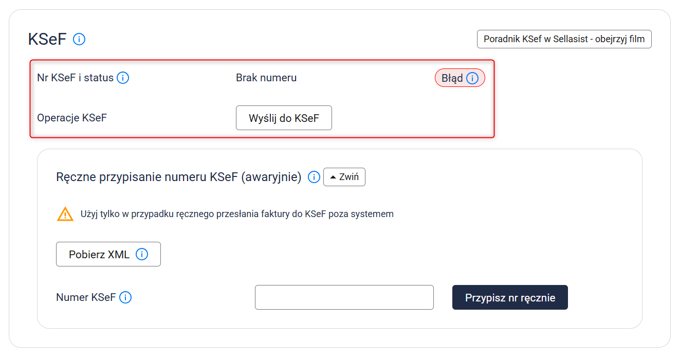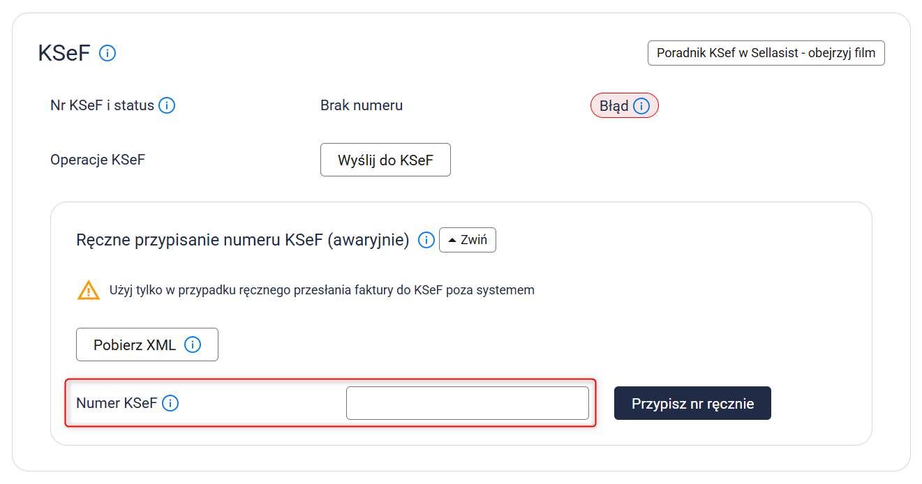 Jeśli z jakiegoś powodu ręczne ponawianie wysyłki nie przynosi efektu, możesz samodzielnie przypisać numer KSeF (awaryjnie). W tym celu: