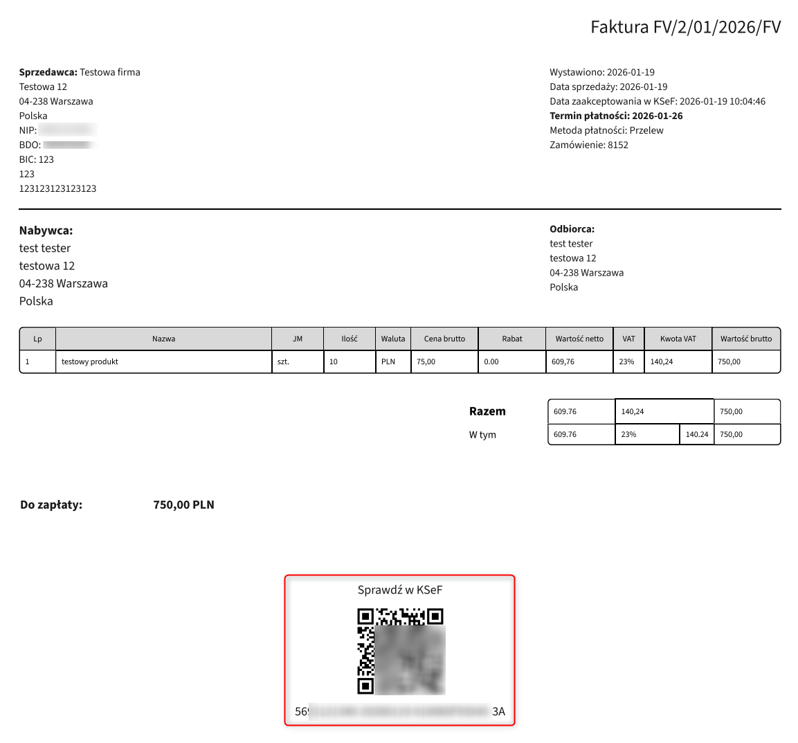 - Data akceptacji KSeF: data i godzina przyjęcia faktury w KSeF, od której dokument jest uznawany za wystawiony.