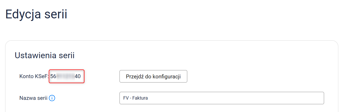 Jeśli dana seria dokumentu posiada podpięte konto KSeF, w jej ustawieniach znajdziesz numer konta (screen poniżej).