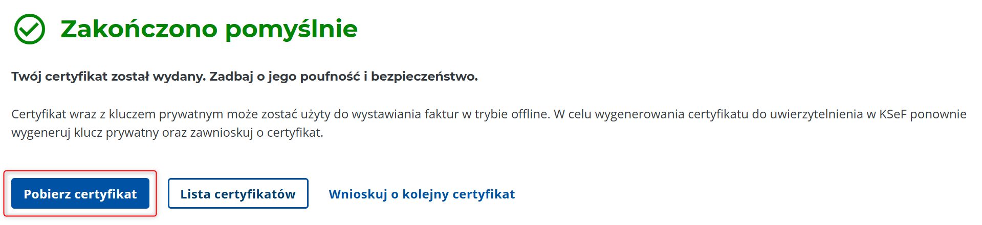 Wskazówka: Certyfikat umożliwia wygenerowanie kodu QR pozwalającego zweryfikować wystawcę dokumentu i jest wymagany do wystawiania faktur w trybie offline, np. gdy dokumenty są wysyłane do KSeF z opóźnieniem lub API KSeF jest chwilowo niedostępne.