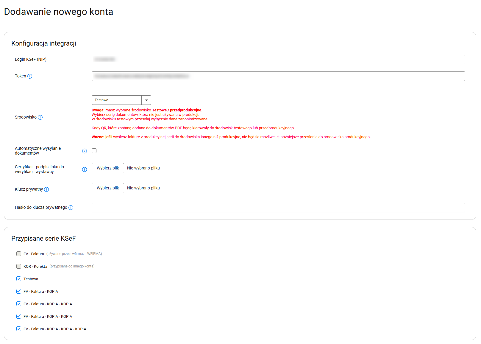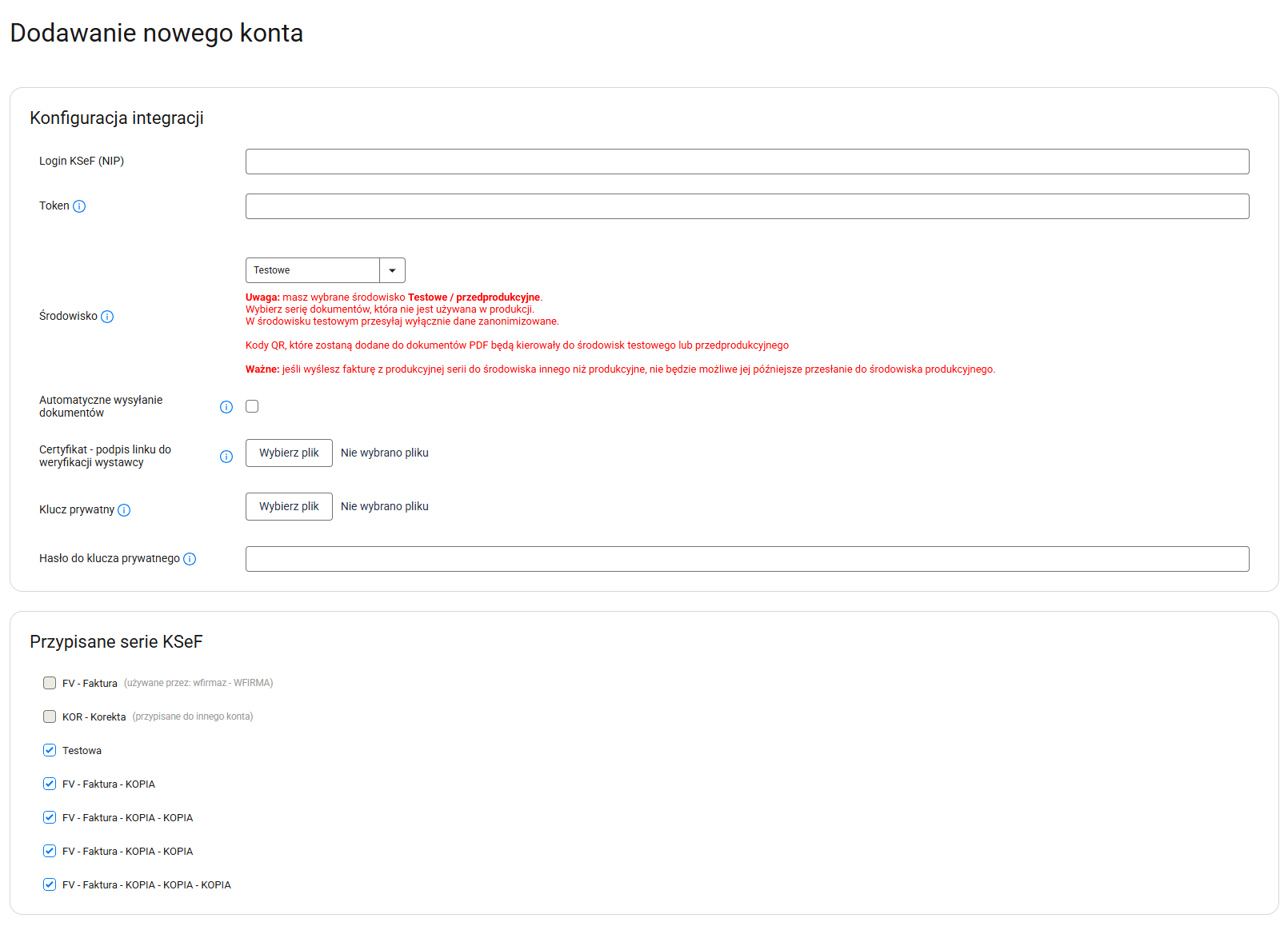 Jeśli dana seria dokumentu nie posiada podpiętego konta KSeF, w jej ustawieniach możesz przejść bezpośrednio do dodawania nowego konta (screen poniżej).