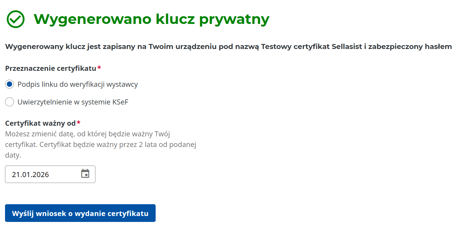 Po wypełnieniu wniosku kliknij przycisk Wyślij wniosek o wydanie certyfikatu.