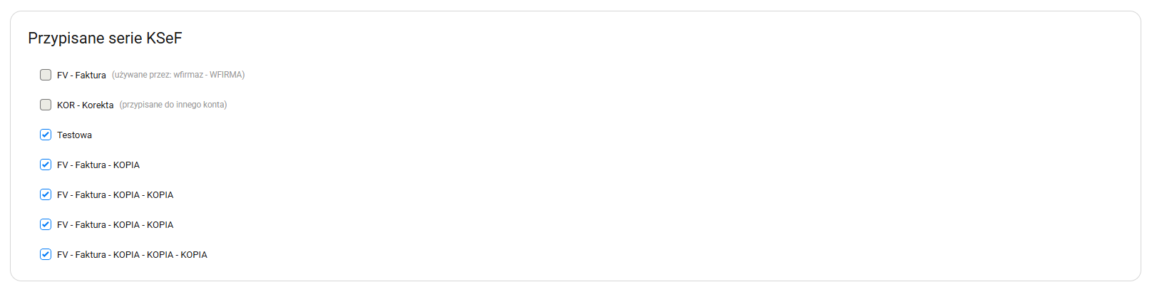 Wybierz serie dokumentów, które chcesz obsługiwać w ramach dodawanego konta KSeF w Sellingo. Wybrane serie będą wykorzystywane do wystawiania i wysyłania dokumentów do KSeF.