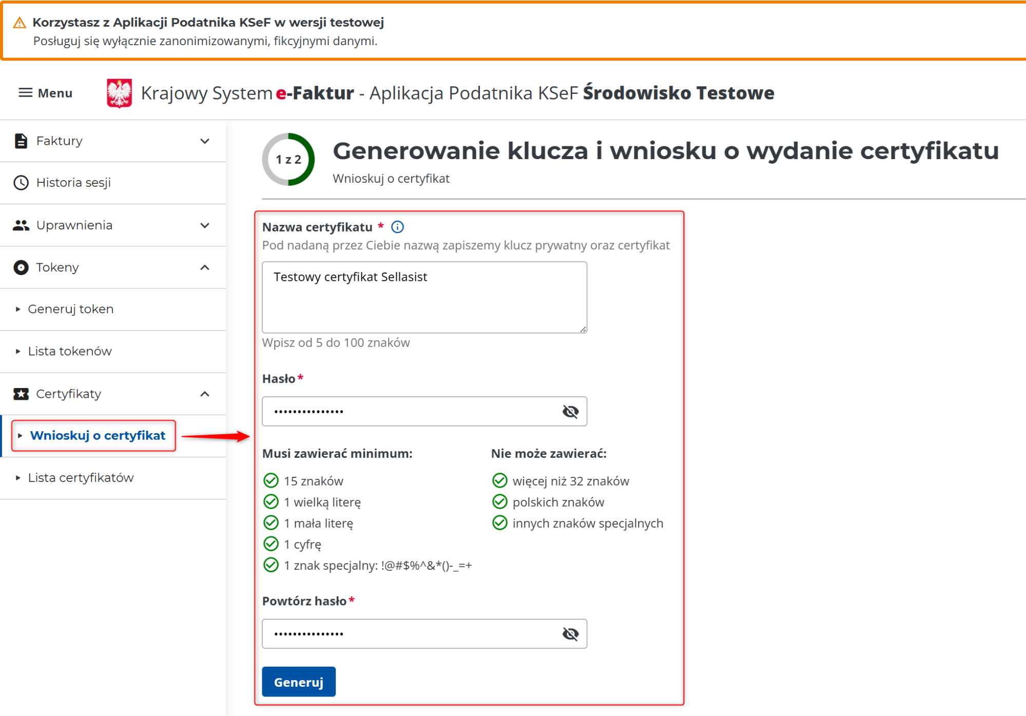 W formularzu wprowadź dowolną nazwę certyfikatu, utwórz hasło i kliknij przycisk Generuj.