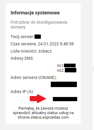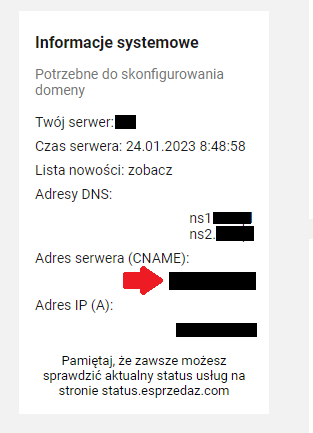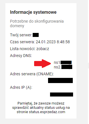 3. Ustaw adresy DNS podane na głównej stronie panelu Twojego sklepu. Jeśli sklep działa na testowej domenie — adresy DNS będą widoczne w panelu. W przeciwnym razie skontaktuj się z nami.