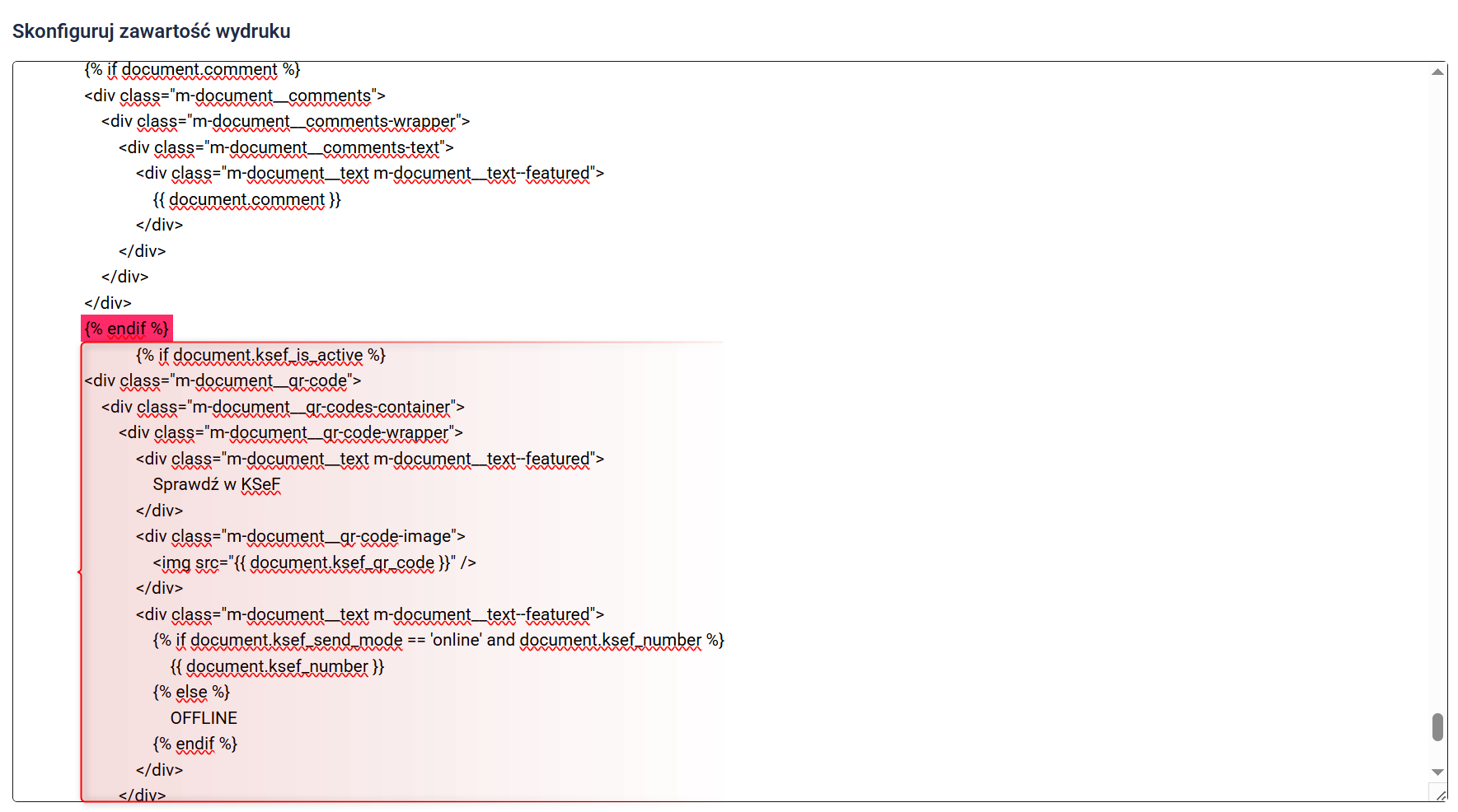 Upewnij się, że Twój zmodyfikowany szablon wydruku posiada fragment kodu odpowiadający za umieszczenie na nim wymaganych kodów QR KSeF.