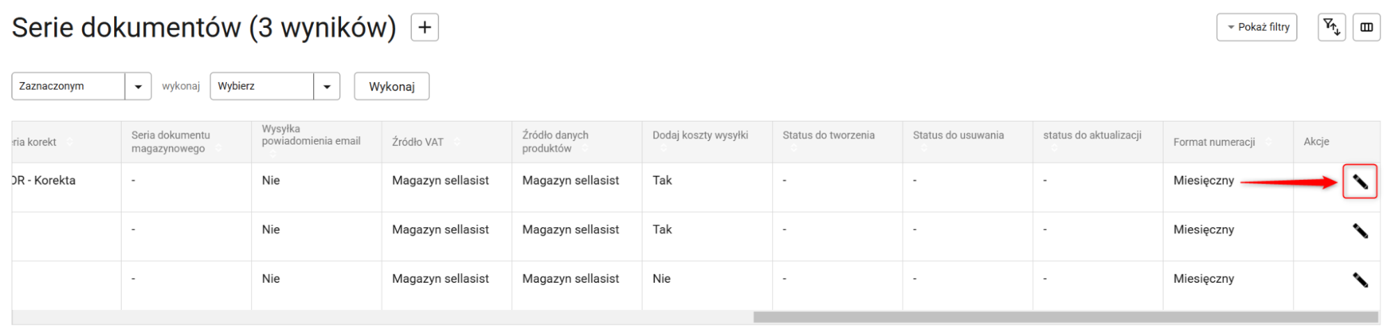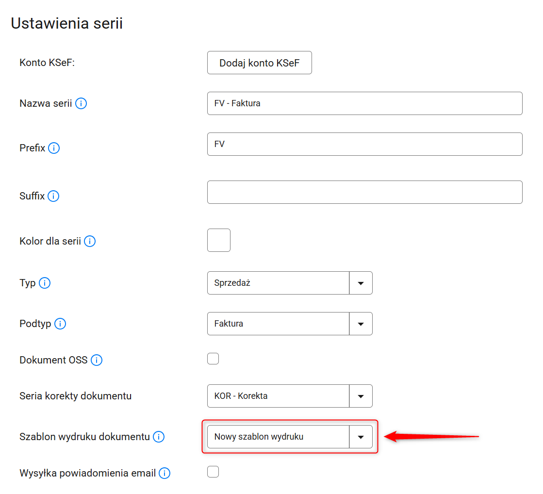 6. Aby aktywować nowy szablon dla konkretnej serii dokumentów, w menu głównym panelu przejdź do Dokumenty [Nowe] → Serie dokumentów i otwórz wybraną pozycję za pomocą przycisku z ikoną ołówka. Następnie w sekcji Ustawienia serii znajdź opcję Szablon wydruku dokumentu, wybierz z listy nowy szablon i kliknij przycisk Zapisz znajdujący się na samym dole strony.