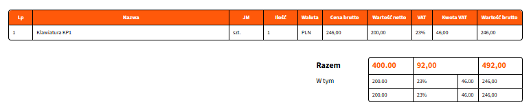 Jeśli chcesz, możesz także zmienić kolor tekstu dla całkowitej wartości zamówienia edytowanego w poprzednim kroku. W tym celu wróć do trzech zmodyfikowanych wcześniej atrybutów style i dodaj w cudzysłowach jeszcze jedną wartość: color: #FF590A;. Wtedy przykładowy atrybut będzie wyglądał następująco: style="color: #FF590A; font-size: 12px; font-weight: bold; width: 65px;".
