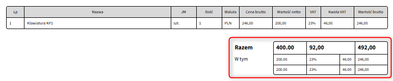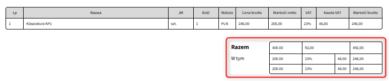 Aby wyróżnić kluczowe dane na dokumencie, możesz zmienić styl wybranych elementów, np. powiększyć i pogrubić tekst w wierszu tabeli z łączną wartością zamówienia. W tym celu znajdź trzy wskazane poniżej wiersze i w każdym z nich zmodyfikuj zaznaczony na czerwono atrybut style, dodając między cudzysłowy wartości font-size: 12px; font-weight: bold;.