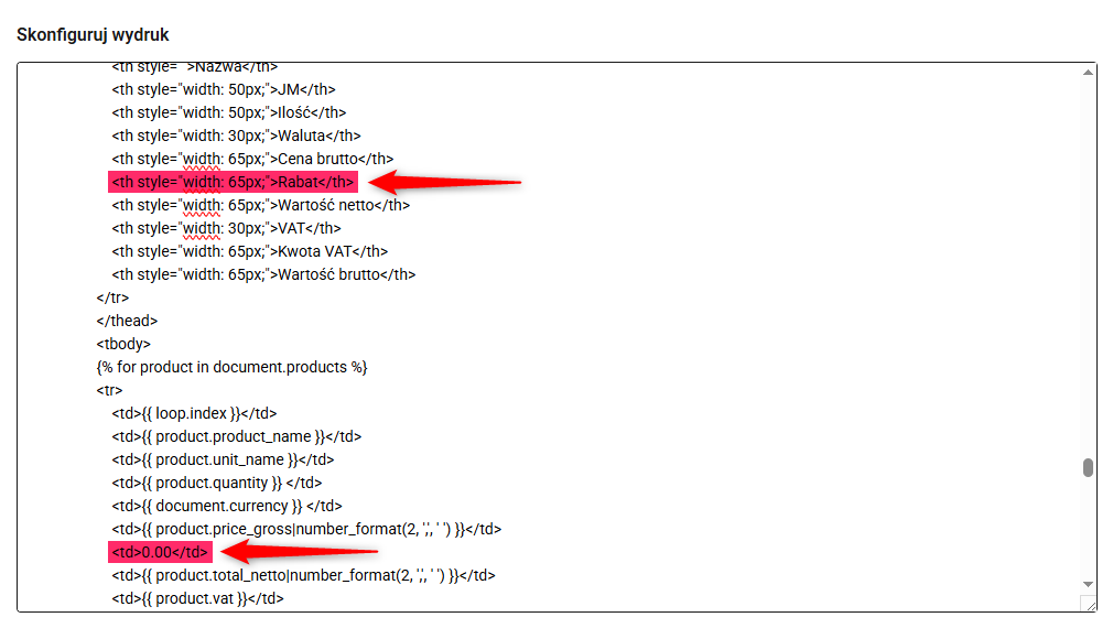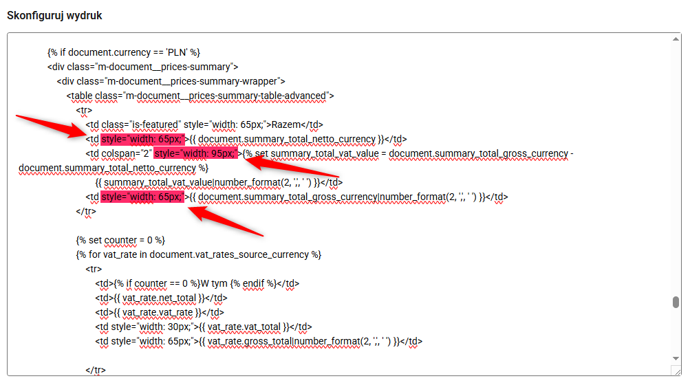 W każdej chwili możesz dostosować wygląd poszczególnych elementów szablonu, modyfikując kod w oknie konfiguracji wydruku (poprzednia sekcja, pkt 5). Poniżej znajdziesz kilka przykładowych, prostych modyfikacji.