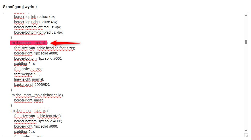 Jeśli chcesz dodać do dokumentu kilka akcentów w firmowym kolorze, możesz np. zmienić kolor nagłówka tabeli na pomarańczowy, edytując właściwości w konkretnej klasie CSS. W tym przypadku, w zaznaczonej na czerwono klasie o nazwie .m-document__table th, zmień wartość parametru background z #D9D9D9 na #FF590A (lub dowolny inny) i dodaj parametry color: #FFF; font-weight: bold; (opcjonalna poprawa widoczności tekstu na kolorowym nagłówku).